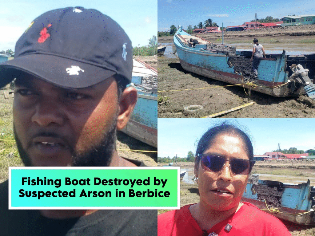 A fishing boat owned by Sherilyn Bhagwandin was engulfed in flames early Wednesday morning, with authorities suspecting arson as the cause of the fire.