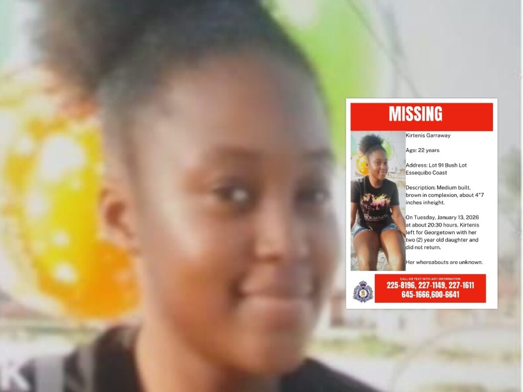 Authorities are seeking assistance in locating Kirtenis Garraway, a 22-year-old woman who has been reported missing. She was last seen on Tuesday, January 13, 2026, at approximately 20:30 hours, when she left her home at Lot 91 Bush Lot, Essequibo Coast, for Georgetown, accompanied by her two-year-old daughter.