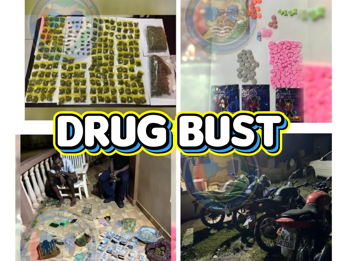At the police station, the confiscated narcotics were weighed, totaling 519 grams and 1.626 kilograms of cannabis, along with 65 grams of ecstasy. The total currencies counted amounted to G$2,174,600, US$572, TT$100, £45, €30, and R$5,416. A quantity of uncustomed goods was also seized during this comprehensive operation.