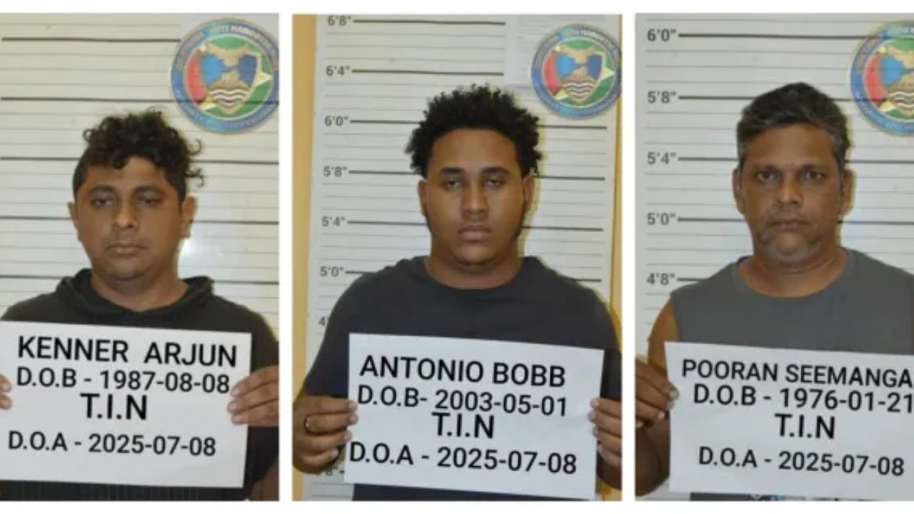 Three men have been remanded to prison following their appearance in court related to the recent seizure of over 24 kilograms of foreign marijuana by the Customs Anti-Narcotic Unit (CANU). Kenner Arjun, Antonio Bobb, and Pooran Seemangal faced Magistrate George at the Leonora Magistrate’s Court on Thursday, July 10, 2025.