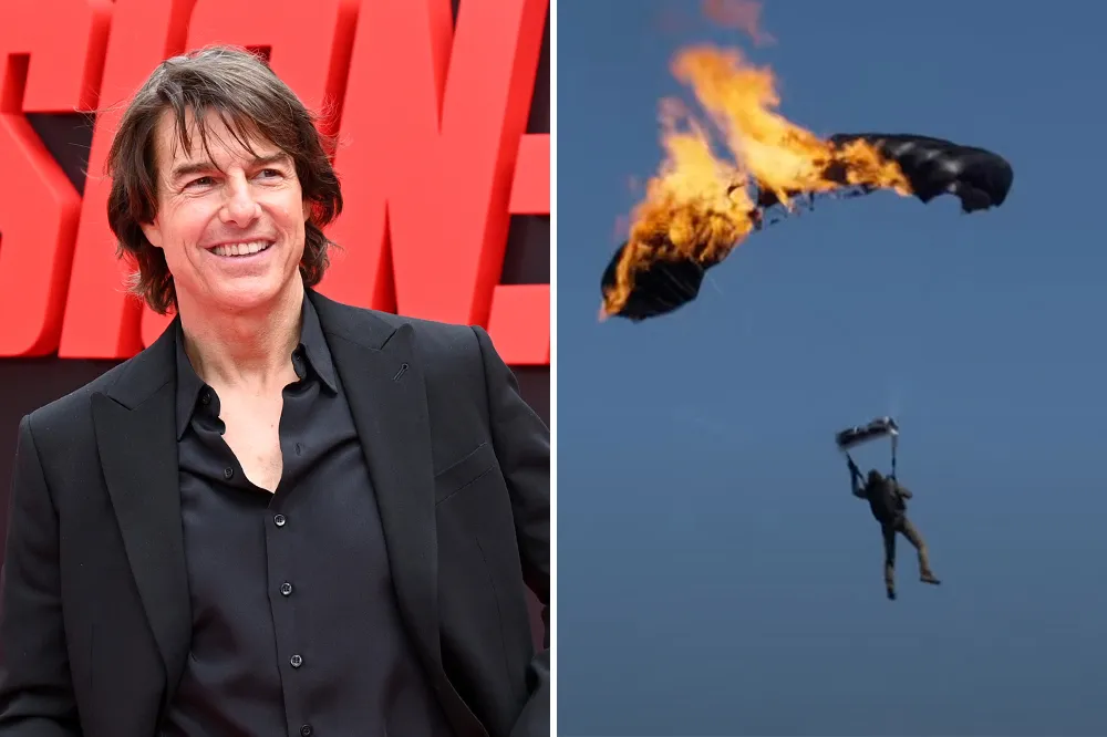 During production, the 62-year-old star leapt from a helicopter 16 times while strapped to a parachute pre-soaked in fuel and lit ablaze. Each time, he cut away the charred remnants of the burnt chute before safely deploying a backup parachute.